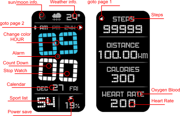 9.Stopwatch , 10.calendar , Power Save , Oxygen blood
