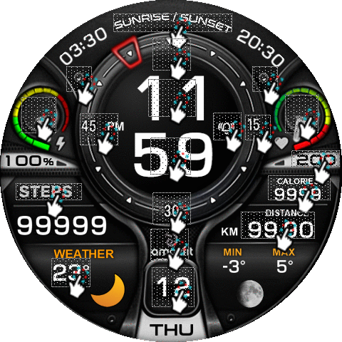 - Add weather, steps, distance, calories, heart rate, battery, date, seconds, spots list, calendar, moon,