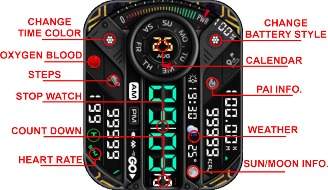 - Add weather, steps, distance, calories, heart rate, battery, date, moon, sports list, calendar,