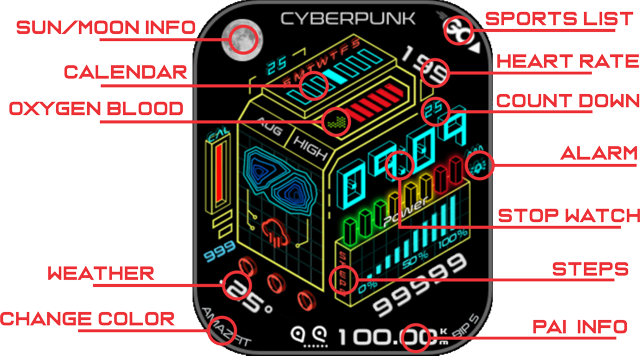 (1. Alarm , 2. sunrise/sunset , 3. temperature, 4. countdown , 5.PAI , 6. Steps , 7. Pulse , 8. SP02 , 9.Stopwatch