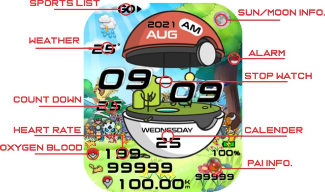 - Add  weather, steps,  calories, heart rate, battery, date, seconds, calendar, sports list, moon,