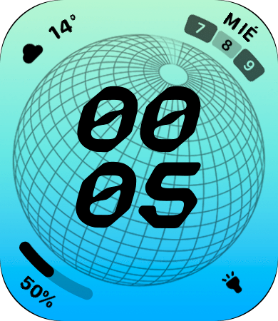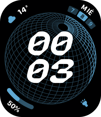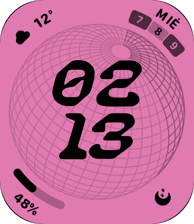 Description: Customizable watchface featuring multiple color themes, bold digits, and matching AOD. A rotating wireframe globe acts as a dynamic seconds indicator, with health, battery, and date useful complications.