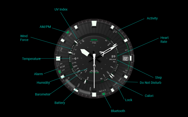 Hi, would someone please create this watchface face from wear os for Gtr4? If possible with the option of having translucent pointers to be able to see the info under them. If possible the main circle contains digital time. If possible to ...