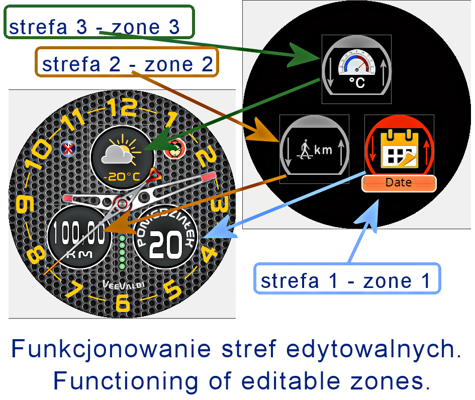 Wyświetlanie innych parametrów na głównej tarczy smartwatcha samodzielnie może ustawić jego użytkownik. Wybiera się tak zwane strefy edytowalne. Są takie 3 strefy edytowalne. Robi się to palcem przyciskając centralnie tarczę zegarka, a następnie wybiera się ikonkę długopisu, a następnie obrazek graficzny strefy. Przesuwając palcem po tym obrazku wybieramy jaki parametr ma być wyświetlany w tej strefie. Akceptacja wyboru – górnym, bocznym przyciskiem na smartwatchu.