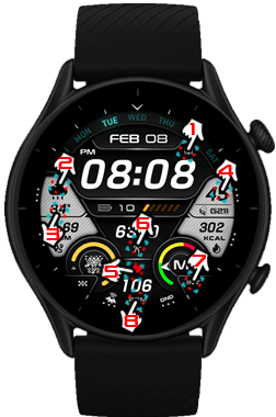 ( 1. Alarm , 2. sunrise/sunset , 3. temperature, 4. stopwatch , 5.PAI , 6. Steps , 7. Pulse , 8. SP02)