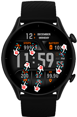 ( 1. Alarm , 2. sunrise/sunset , 3. temperature, 4. stopwatch , 5.PAI , 6. Steps , 7. Pulse , 8. SP02)
