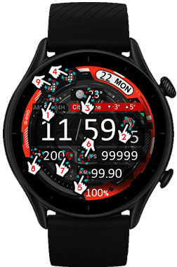 ( 1. Alarm , 2. sunrise/sunset , 3. temp. , 4. stopwatch , 5.PAI , 6. Steps , 7. Pulse , 8. SP02 , 9. Countdown )