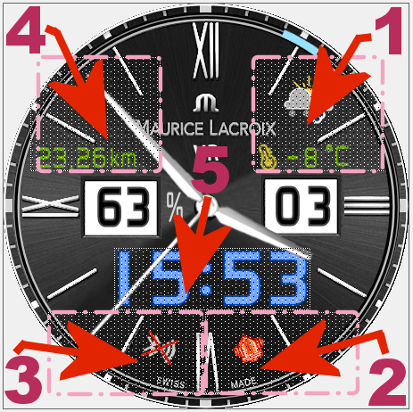 I also used 5 touch fields (touch zones, i.e. shortcuts). The location of these touch areas on the watch face is shown in the image above.