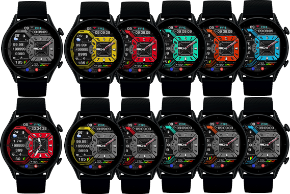 (1. Alarm , 2. sunrise/sunset , 3. temperature, 4. countdown , 5.PAI , 6. Steps , 7. Pulse , 8. SP02 , 9.Stopwatch) 10. calendar