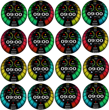 (1. Alarm ,  2. sunrise/sunset , 3. temperature, 4. countdown ,  5.PAI ,  6. Steps ,  7. Pulse , 8. SP02 , 9.Stopwatch, calendar)