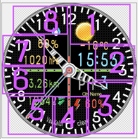 I also used as many as 8 touch fields on the watch face (shortcuts). The location of these touch areas is shown in the picture above.