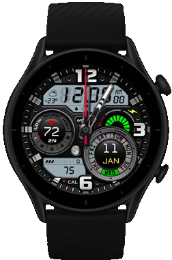 (1. Alarm ,  2. sunrise/sunset , 3. temperature, 4. countdown ,  5.PAI ,  6. Steps ,  7. Pulse , 8. SP02 , 9.Stopwatch , 10.calendar , 11.sport list , 12.Compass )