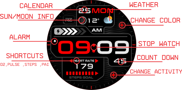 (1. Alarm , 2. sunrise/sunset , 3. temperature, 4. countdown , 5.PAI , 6. Steps , 7. Pulse , 8. SP02 , 9.Stopwatch , 10.calendar