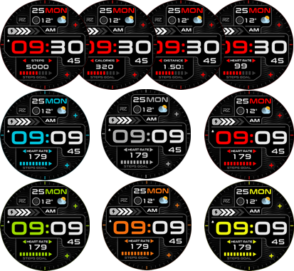 - Add weather, steps, distance, calories, heart rate, battery, date, seconds,