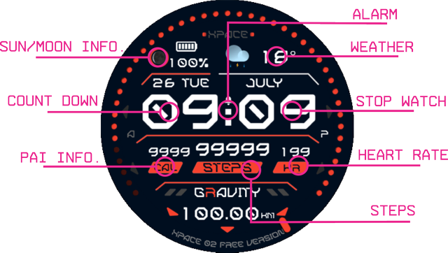 (1. Alarm , 2. sunrise/sunset , 3. temperature, 4. countdown , 5.PAI , 6. Steps , 7. Pulse , 8. SP02 , 9.Stopwatch