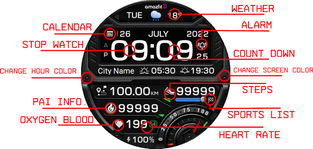 (1. Alarm , 2. sunrise/sunset , 3. temperature, 4. countdown , 5.PAI , 6. Steps , 7. Pulse , 8. SP02 , 9.Stopwatch , 10.calendar