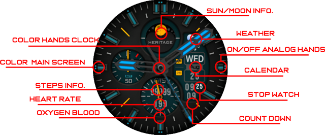 (1. Alarm ,  2. sunrise/sunset , 3. temperature, 4. countdown ,  5.PAI ,  6. Steps ,  7. Pulse , 8. SP02 , 9.Stopwatch , 10.calendar , Sports list