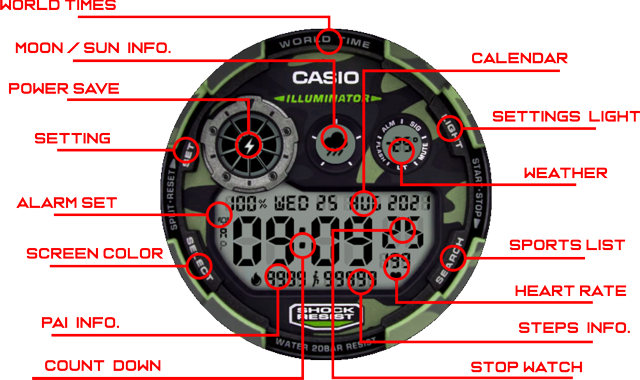 (1. Alarm , 2. sunrise/sunset , 3. temperature, 4. countdown , 5.PAI , 6. Steps , 7. Pulse , 8. SP02 , 9.Stopwatch , 10.calendar , Sports list