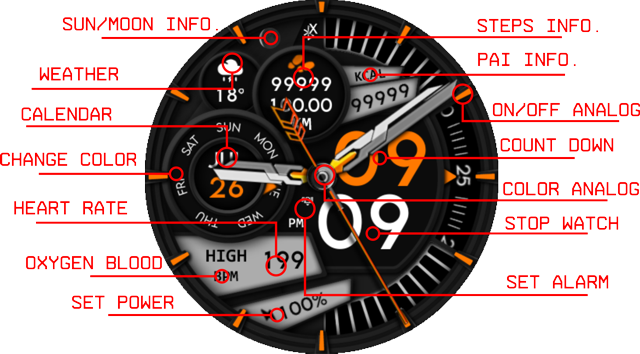 (1. Alarm ,  2. sunrise/sunset , 3. temperature, 4. countdown ,  5.PAI ,  6. Steps ,  7. Pulse , 8. SP02 , 9.Stopwatch , 10.calendar
