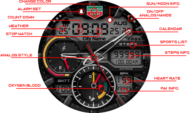 (1. Alarm , 2. sunrise/sunset , 3. temperature, 4. countdown , 5.PAI , 6. Steps , 7. Pulse , 8. SP02 , 9.Stopwatch , 10.calendar , Sports list