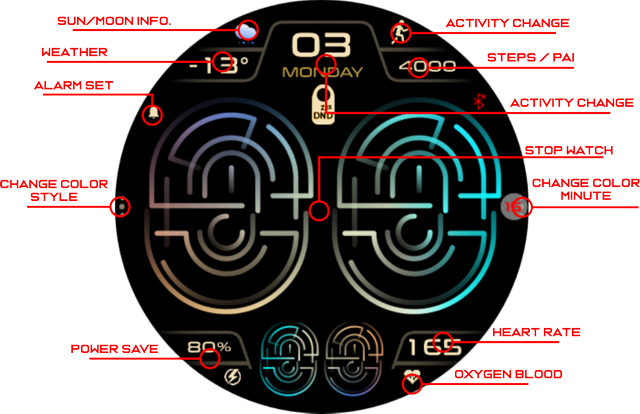 (1. Alarm , 2. sunrise/sunset , 3. temperature, 4. countdown , 5.PAI , 6. Steps , 7. Pulse , 8. SP02 , 9.Stopwatch , 10.calendar , Power Save