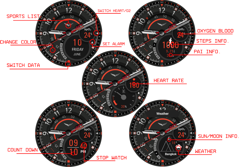 (1. Alarm ,  2. sunrise/sunset , 3. temperature, 4. countdown ,  5.PAI ,  6. Steps ,  7. Pulse , 8. SP02 , 9.Stopwatch , 10.calendar , Sports list