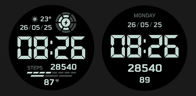 In the preview version, all metrics, time, etc. do not change — they show a single fixed value. This allows you to visually evaluate whether the watch face suits you or not.