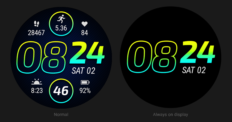 In the preview version, all metrics, time, etc. do not change — they show a single fixed value. This allows you to visually evaluate whether the watch face suits you or not.
