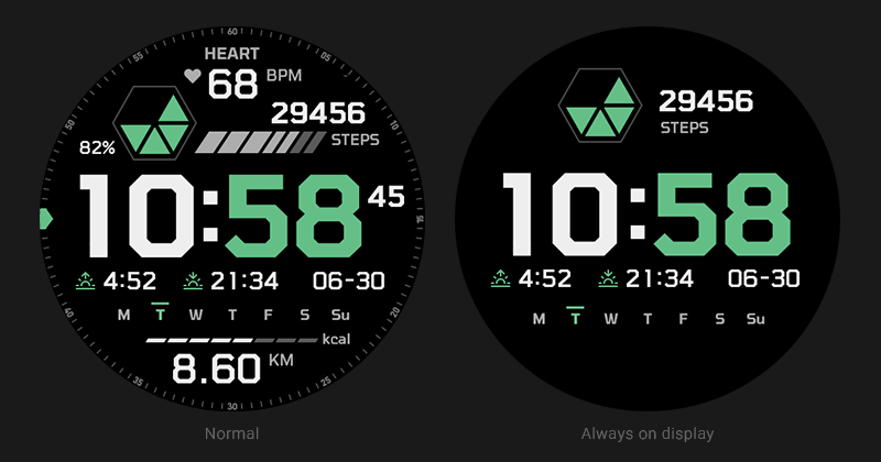 In the preview version, all metrics, time, etc. do not change — they show a single fixed value. This allows you to visually evaluate whether the watch face suits you or not.