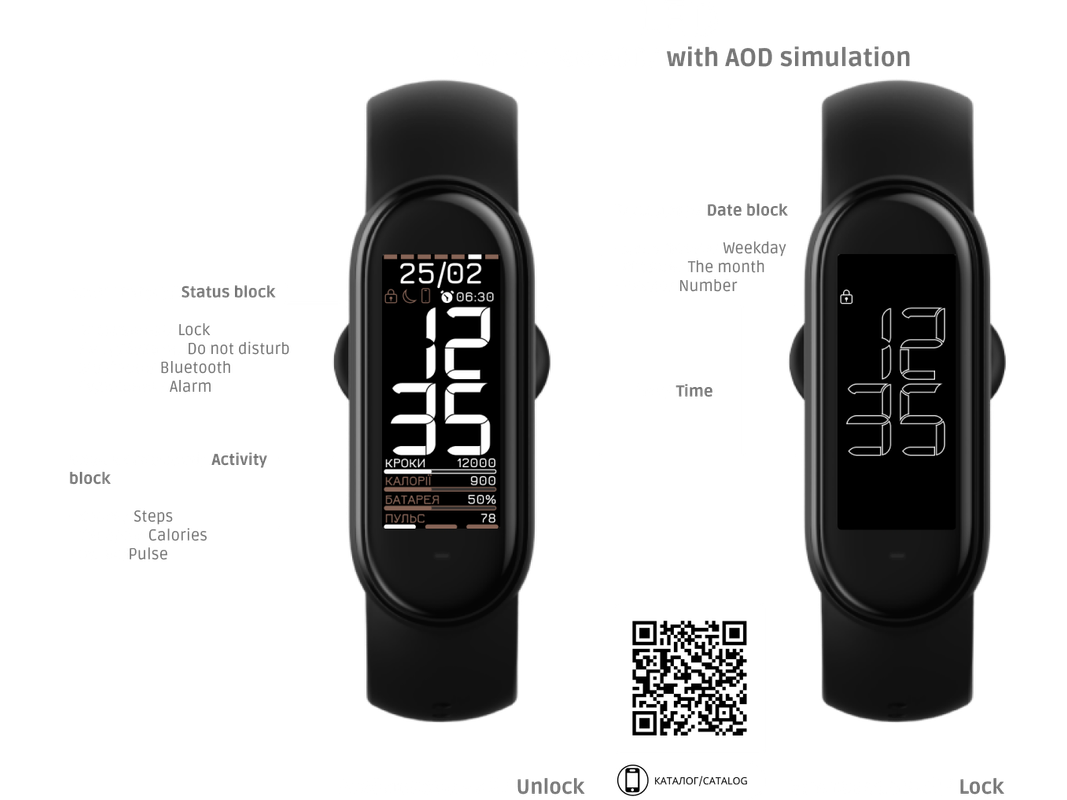 Спроба реалізувати функцію AOD на Mi Smart Band 5. Для коректної роботи циферблату потрібно включити блокування екрану. На розблокованому екрані відображається вся необхідна інформація. Дата з індикатором дня тижня (сім сегментів від понеділка до неділі). Рядок стану з відображенням блокування, "не турбувати", підключення до телефону (блютуз) та будильника. Далі величезний показник часу. Нижче розмістився блок активності з відображення кроків, калорій, заряду батареї з їх прогресом та пульс з його рівнем (3 рівня). Після блокування на екрані залишається тільки час з модифікованим шрифтом та показник заблокованого екрану.