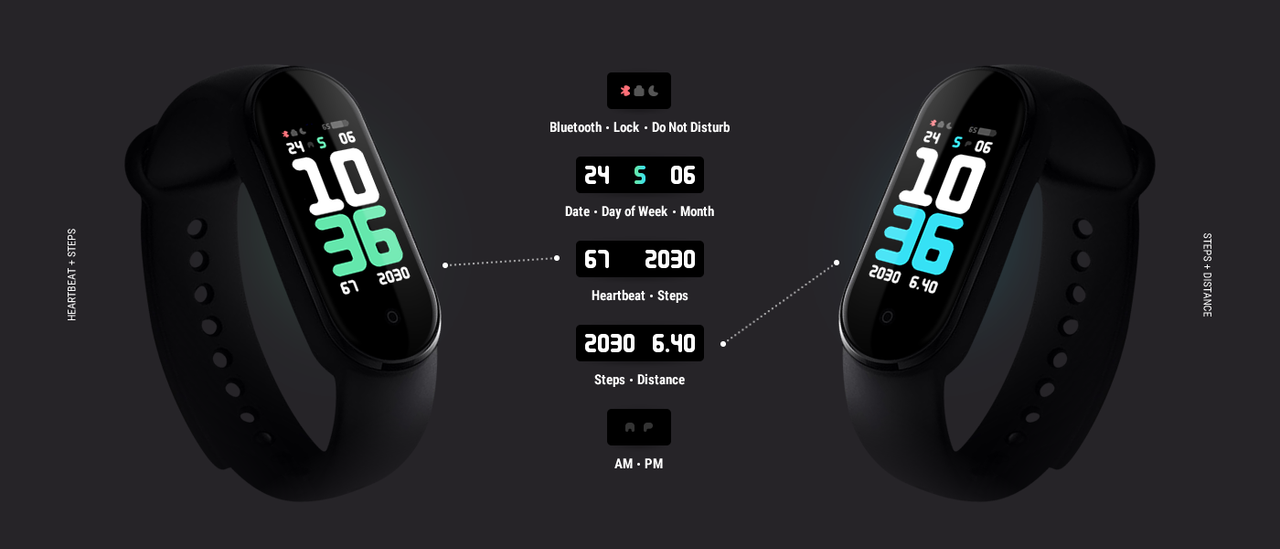 Hi, I've just bought a Xiaomi Band 9 Active (i.e. the rectangular one). This can show multiple info on screen, including hour, minutes, seconds, date, weekday, steps, calories, heartrate, uptime, meteo, temp. Unfortunately there is no watch...