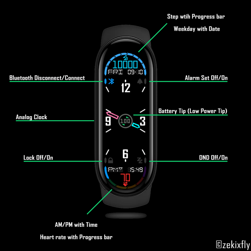 Hi, I've just bought a Xiaomi Band 9 Active (i.e. the rectangular one). This can show multiple info on screen, including hour, minutes, seconds, date, weekday, steps, calories, heartrate, uptime, meteo, temp. Unfortunately there is no watch...