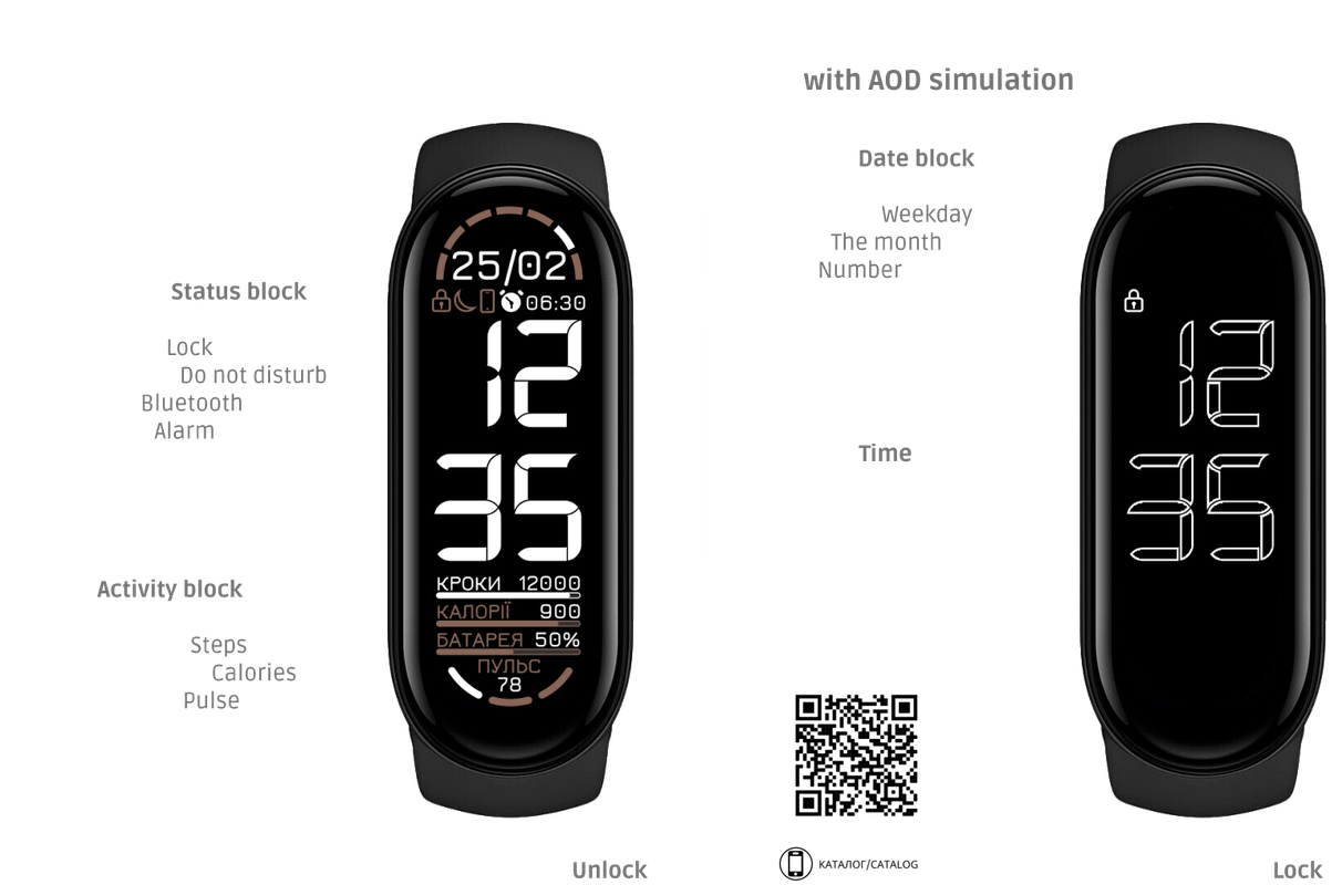 Спроба реалізувати функцію AOD на Mi Smart Band 6. Для коректної роботи циферблату потрібно включити блокування екрану. На розблокованому екрані відображається вся необхідна інформація. Дата з індикатором дня тижня (сім сегментів від понеділка до неділі). Рядок стану з відображенням блокування, "не турбувати", підключення до телефону (блютуз) та будильника. Далі величезний показник часу. Нижче розмістився блок активності з відображення кроків, калорій, заряду батареї з їх прогресом та пульс з його рівнем (3 рівня). Після блокування на екрані залишається тільки час з модифікованим шрифтом та показник заблокованого екрану.