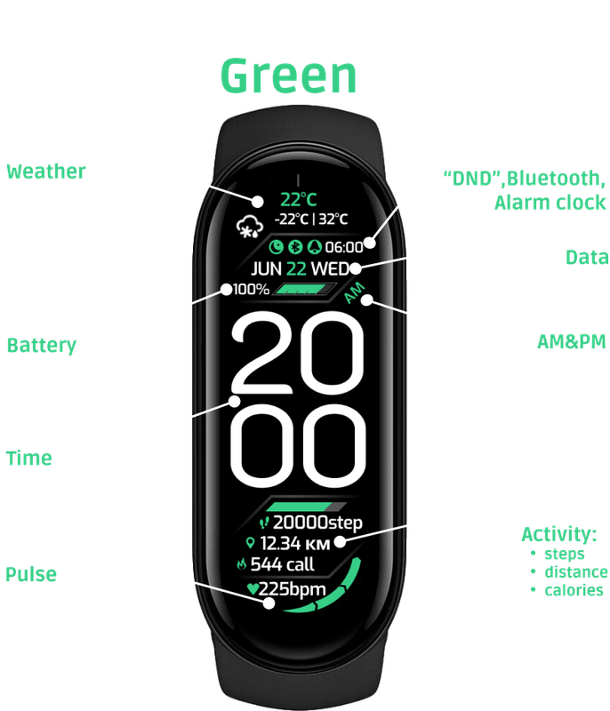 Hi, I've just bought a Xiaomi Band 9 Active (i.e. the rectangular one). This can show multiple info on screen, including hour, minutes, seconds, date, weekday, steps, calories, heartrate, uptime, meteo, temp. Unfortunately there is no watch...