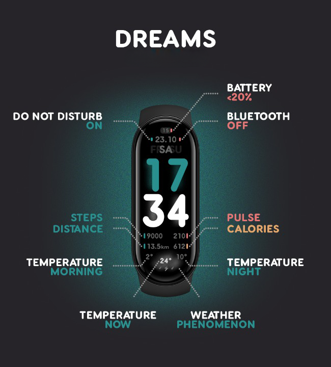 Hi, I've just bought a Xiaomi Band 9 Active (i.e. the rectangular one). This can show multiple info on screen, including hour, minutes, seconds, date, weekday, steps, calories, heartrate, uptime, meteo, temp. Unfortunately there is no watch...