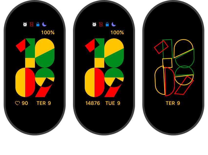 Hi, I've just bought a Xiaomi Band 9 Active (i.e. the rectangular one). This can show multiple info on screen, including hour, minutes, seconds, date, weekday, steps, calories, heartrate, uptime, meteo, temp. Unfortunately there is no watch...