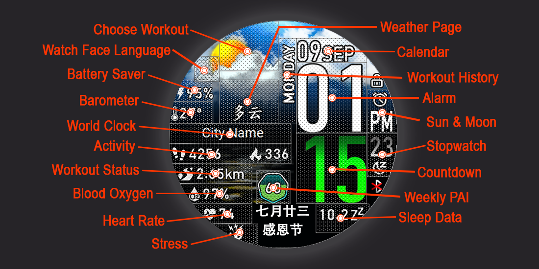 - 有了这个表盘,无论您的手表固件属于哪个版本,您都可以随时打开/关闭农历日期和节日。