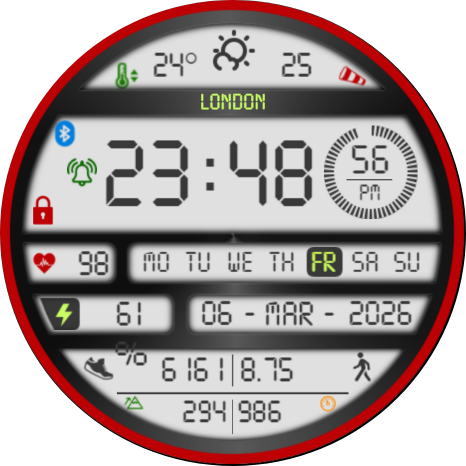 - Shortcuts (BPM, Alarm, Meteo, battery)